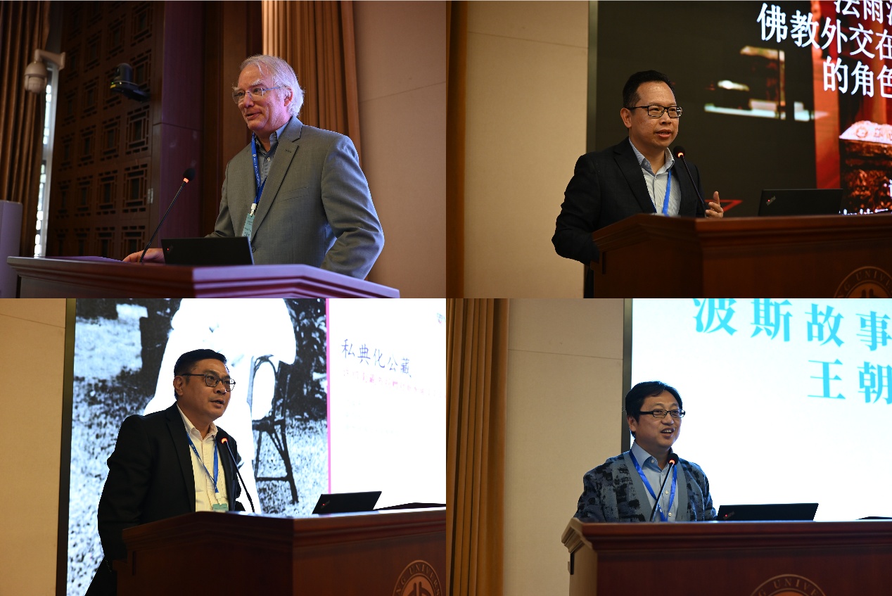 上午开幕式结束后,由王昌伟教授主持主旨发言环节。云茂潮中华文化研究中心主任、新加坡国立大学中文系丁荷生(Kenneth Dean)教授以“海洋亚洲华文文献与数字人文”为题,归纳了东南亚华人社群所保存的民间文献,并介绍了其团队在多语种文献整理与数字化平台方面的最新成果。新加坡国立大学历史学系谢明达副教授以“法雨润邻:佛教外交在中新关系中的角色与意涵”为题,通过宏船法师的访华经历以及《倒塌佛塔的秘密》艺术展等案例,揭示了佛教外交在世俗国家外交实践中的独特作用。陈明教授以“下南洋:民国时期中国佛教徒的求法与弘教”为题,梳理了民国时期中国僧人赴南亚、东南亚求法与弘教的第一手档案资料,揭示了佛教南传在中外文明交流互鉴中的历史脉络与文化内涵。新加坡国立大学图书馆沈俊平副馆长以“私典化公藏:许绍南藏书捐赠对新加坡汉学学术生态的构建”为题,回顾了许绍南整理中国学术资料的历程,并揭示了许先生所捐赠的七千余册藏书对汉学研究和中新学术交流的杰出贡献。华体买球_华体(中国)东南亚系副系主任金勇长聘副教授以“波斯故事与泰国阿瑜陀耶王朝的政治文化”为题,探讨波斯文化对泰国宫廷文学的影响,并指出《伊朗王道故事十二则》为泰国宫廷文人佛教化后编撰的劝诫书,反映了国王与贵族势力之间的政治博弈。