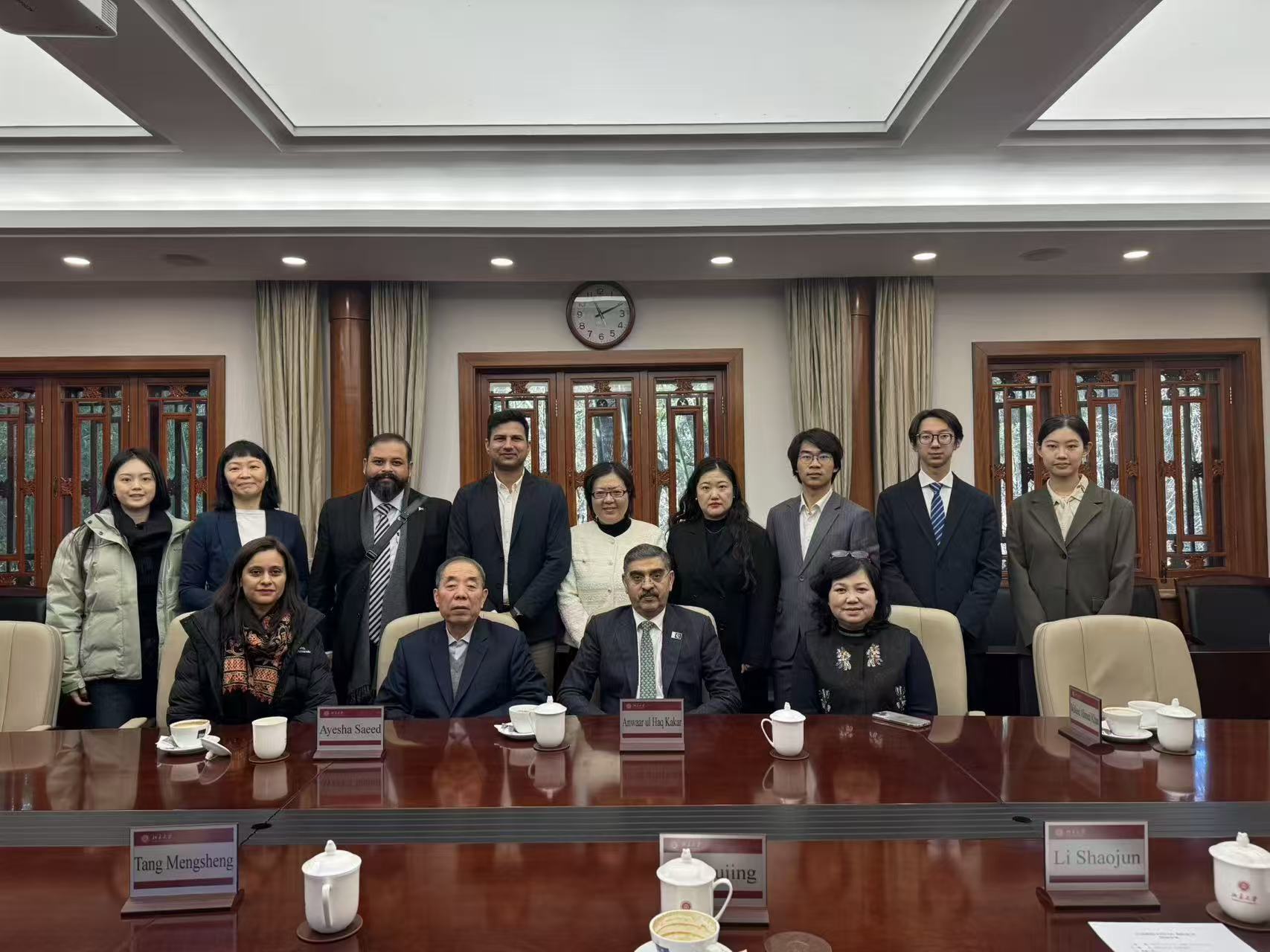 2025年12月2日上午,巴基斯坦前总理、巴基斯坦EMPAK智库主席安瓦尔・哈克・卡卡尔(Anwaar ul Haq Kakar)一行到访北京大学。在与北京大学党委副书记、校务委员会副主任姜国华会谈后,代表团在临湖轩西厅与外国语学院巴基斯坦研究中心/乌尔都语专业师生开展座谈交流。外国语学院党委书记李淑静教授、巴基斯坦研究中心创始主任唐孟生教授、中国国际投资促进会执行秘书长李少君等,及乌尔都语专业外教阿舍得(Muhammad Arshad Bhatti)和学生代表参加了座谈活动。座谈由巴基斯坦研究中心主任、南亚学系副系主任张嘉妹主持。